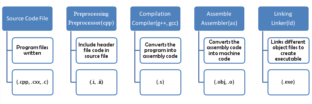 When you write a c++ program, the next step is to compile the program before running it. The compilation is the process which convert the program written in human readable language like C, C++ etc into a machine code, directly understood by the Central Processing Unit. There are many stages involved in creating a executable file from the source file. The stages include Preprocessing, Compiling and Linking in C++. This means that even if the program gets compiled, it may result in not running as errors may arise during the linking phase. Hence most IDE (Integrated Development Environment ) like Eclipse, Geany etc consider the term build for transforming source code file to an executable file.