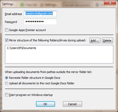But before the first file can be copied, the Settings dialog pops up allowing the end user to enter the Google Docs account details. In addition, the following options can be set: