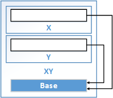 It is at the end of the 'XY' object that memory for the shared subobject 'Base' is most probable to be allocated. The exact implementation of the class depends on the compiler. For example, the classes 'X' and 'Y' may store pointers to the shared object 'Base'. But as far as I understand, this practice is out of use nowadays. A reference to a shared subobject is rather implemented through offset or as information stored in the virtual function table.