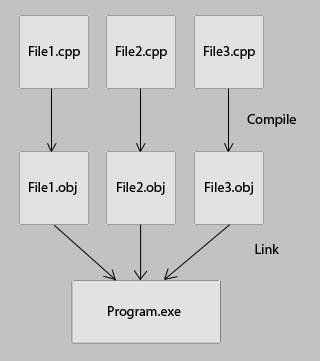 First, each .cpp file is compiled independently. During this process any #include directives will first insert the included file into the .cpp. Compilation then processes the .cpp from top to bottom, generating machine language code and outputting this into an .obj file. The thing to keep in mind for purposes of this discussion is that it is a single pass process from top to bottom, and that it is completely unaware of anything in other .cpp files. Nor is the compiler even aware of anything in the current .cpp file at any point beyond the point at which it is processing. The code generated by the compiler does not fully resolve memory addressing and function calls. That’s the job of the linker. When the compiler encounters a function call in a .cpp file, it usually has no idea what the function does, or how it does it. All the compiler need to know is what parameters are passed and what type the return value is. The .obj code for the function call can be generated, and the linker will figure out exactly where to make the jump later.