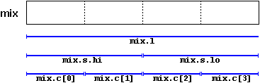 defines three names that allow us to access the same group of 4 bytes: mix.l, mix.s and mix.c and which we can use according to how we want to access these bytes, as if they were a single long-type data, as if they were two short elements or as an array of char elements, respectively. I have mixed types, arrays and structures in the union so that you can see the different ways that we can access the data. For a little-endian system (most PC platforms), this union could be represented as: