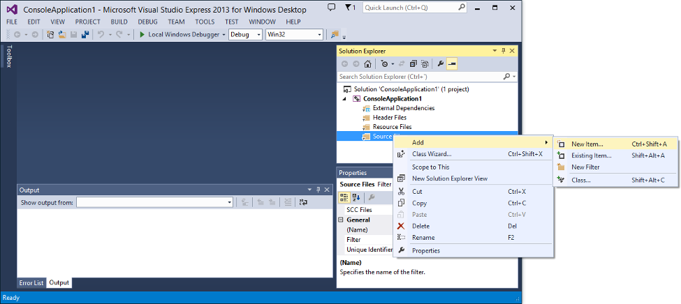 Templates -> Visual C++. Then, on the central part, select Win32 Console Application: